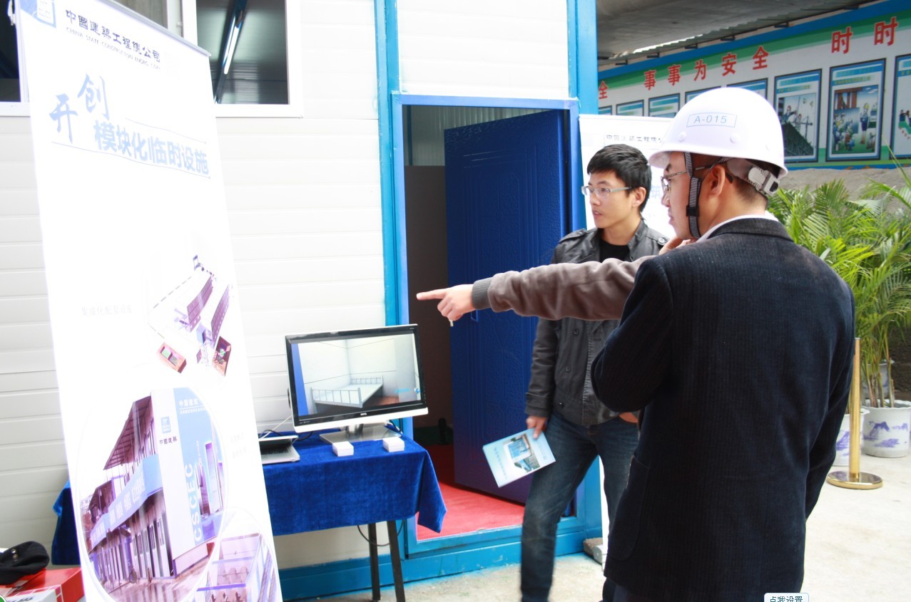 中建四局标准化设施加工基地出品的可周转临时设施系统,注重新型环保材料和加工技术,集安全、便捷、节能、环保、舒适于一体,样板房展示受到参会单位极大的关注,并对这一新型临时设施纷纷提问,加工基地技术负责人杨延超也从具体的性能、优势、售后等方面为大家做了详细解答。