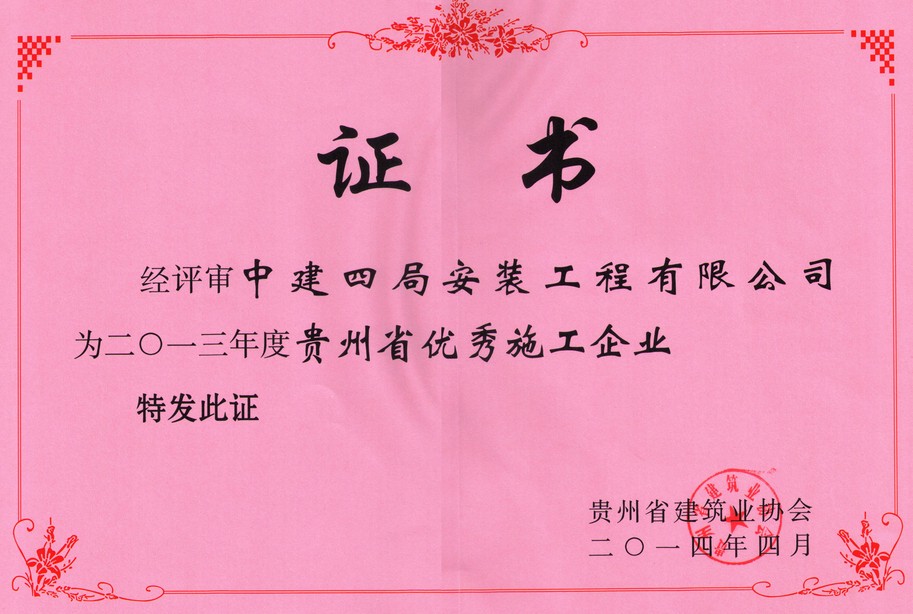 经贵州省建筑业协会评审委员会审定,公司获2013年度贵州省优秀施工企业称号,这是公司连续第10年获得此称号。2013年,公司实现了持续、稳健、快速的发展,各项工作均取得了长足的进步,营业额、效益保持了两位数增长;同时,品牌建设卓见成效,社会影响力和信誉度飞速提升,占据了业内不可或缺的地位,2013年更是一年内获得三项鲁班奖,刷新了历史,大大提升了品牌价值。