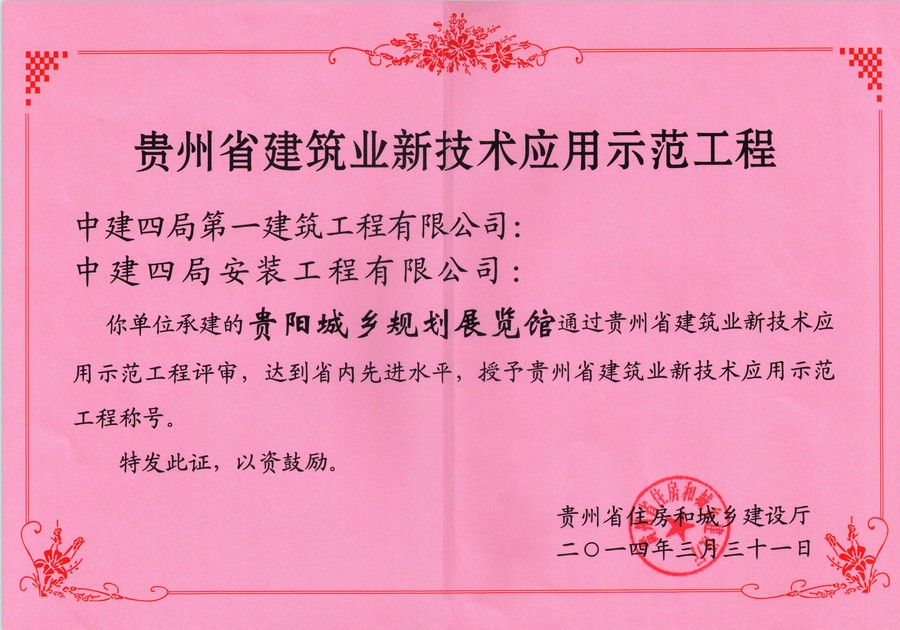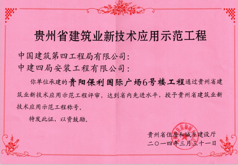 贵阳保利国际广场6号楼工程、贵阳城乡规划展览馆两项目被贵州省住房和城乡建设厅授予贵州省建筑业新技术应用示范工程称号。