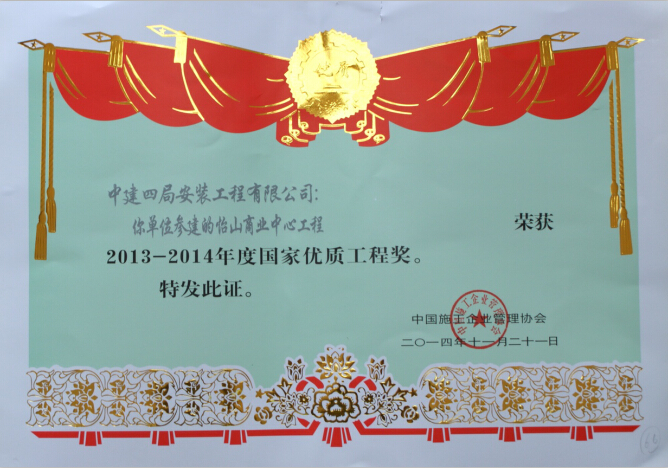 近日,厦门分公司参建的怡山商业广场中心项目荣获“国家优质工程奖”,该奖是工程建设质量方面的最高荣誉奖励。