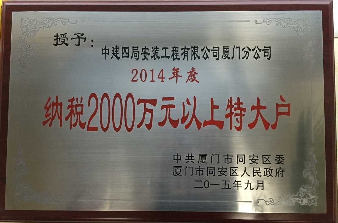 11月12日,厦门市同安区建设局、经信局联合为厦门分公司颁发纳税大户荣誉奖牌,授于厦门分公司2014年度纳税大户荣誉,并给予奖励。