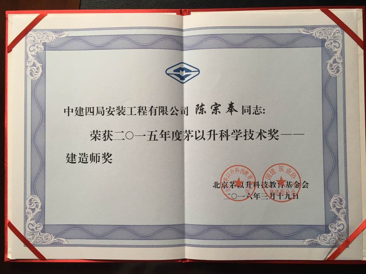 2016年10月12日,“建造师执业能力与实践经验交流暨第八届全国优秀建造师表彰会”在杭州落下帷幕,安装公司南方分公司广州周大福金融中心机电项目经理陈宗奉喜获“2015年度茅以升科学技术奖——建造师奖”。
