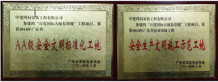 近日,南方分公司深圳百度国际大厦项目荣获广东省“AA级安全文明标准化工地”、“安全生产文明施工示范工地”双优称号。