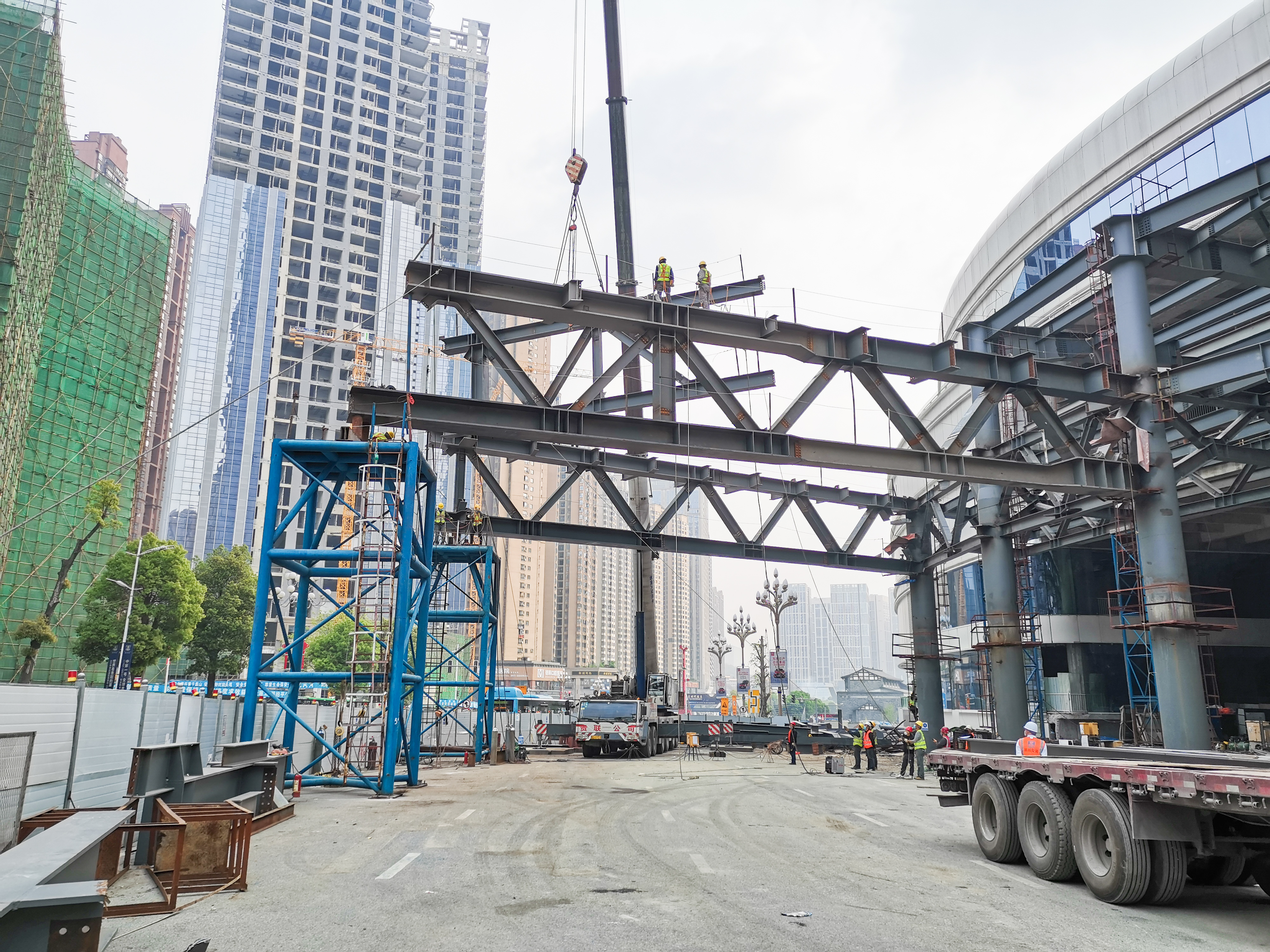 近日,两台260吨的吊车经过一个半小时的连续作业,安装公司贵阳花果园D区双子塔项目DN连桥首片跨路钢结构桁架实现成功吊装,标志着DN连桥正式进入第二施工阶段。